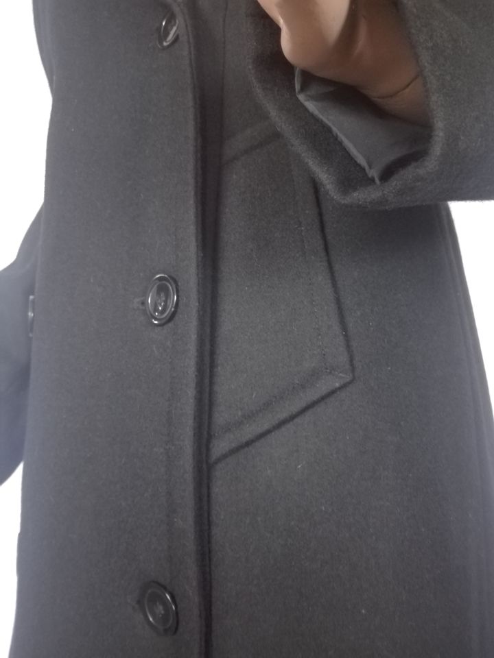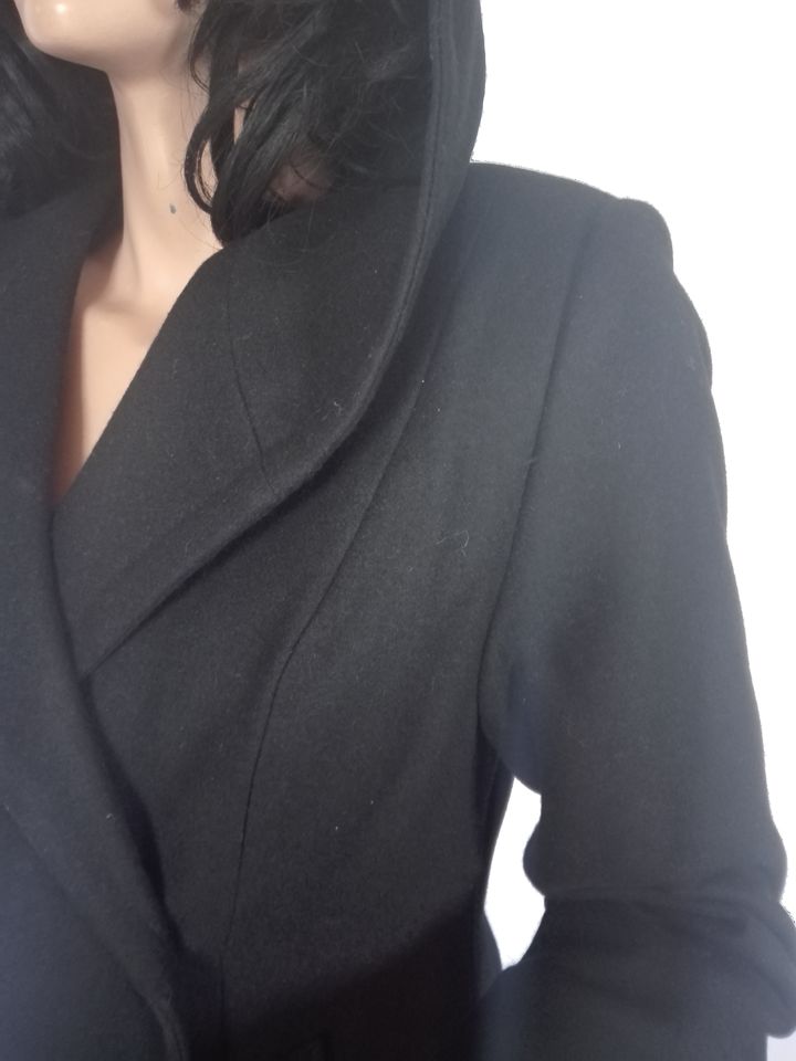 Palton dama cambrat, lung cu doua randuri de nasturi si gluga dubla formata din doua piese.